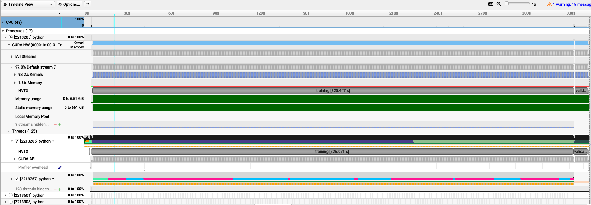 The following trace is obtained for batch_size=4. It shows you various NVTX ranges that were added in the PyTorch script, allowing you to see the time spent in data preparation, training, validation, and model saving phases. If you uncomment the line with #with torch.autograd.profiler.emit_nvtx():, you will also see detailed kernel launches in PyTorch.
